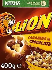 Nestlé produce a spin-off breakfast cereal called "Lion Cereal" which is described as “the King of Cereals” and contains chocolate, caramel and whole grain to make it taste like the Lion chocolate bar.[11][12]