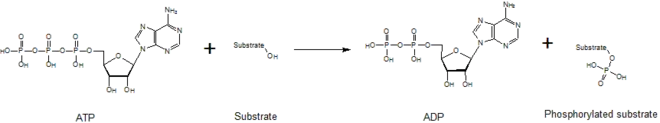 Kinases mediate the transfer of a phosphate moiety from a high energy molecule (such as ATP) to their substrate molecule, as seen in the figure below. Kinases are needed to stabilize this reaction because the phosphoanhydride bond contains a high level of energy. Kinases properly orient their substrate and the phosphoryl group within their active sites, which increases the rate of the reaction. Additionally, they commonly use positively charged amino acid residues, which electrostatically stabilize the transition state by interacting with the negatively charged phosphate groups. Alternatively, some kinases utilize bound metal cofactors in their active sites to coordinate the phosphate groups. Protein kinases can be classed as catalytically active (canonical) or as pseudokinases, reflecting the evolutionary loss of one or more of the catalytic amino acids that position or hydrolyse ATP.[6] However, in terms of signalling outputs and disease relevance, both kinases and pseudokinases are important signalling modulators in human cells, making kinases very important drug targets.[7]