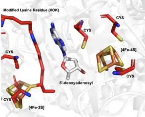 As previously mentioned, lipoyl synthase is a member of a subfamily of the radical SAM(S-adenosyl methionine) enzyme family, which use a [4Fe-4S] cluster cofactor. This cofactor is used by this enzyme to produce 5'-deoxyadenosyl 5'-radical (5'-dA).[2] Lipoyl synthase itself uses this radical to abstract hydrogens from the 6th and 8th carbons of the protein N6(octanoyl)lysine substrate. Two sulfurs from one of lipoyl synthase's two [4Fe-4S] clusters, known as the auxiliary cluster, are then attached to the 6th and 8th carbons in place of the abstracted hydrogens.The protein N6-(octanoyl)lysine substrate is then converted into the protein N6-(lipoyl)lysine. The figure on the right depicts the lysine interacting with the auxiliary cluster to add one sulfur, which then becomes an [4Fe-3S] cluster. The other [4Fe-4S] cluster is coordinated by the radical SAM motif of the enzyme (CxxxCxxC) and participates in radical SAM characteristic chemistry to activate the substrate for subsequent sulfur insertion.[3] The three substrates of this enzyme are N6-(octanoyl)lysine, sulfur, and S-adenosyl-L-methionine. The three products are N6-(lipoyl)lysine, L-methionine, and 5'-deoxyadenosine. Below displays the overall reaction catalyzed by lipoyl synthase, with the structures of each substrate and product.