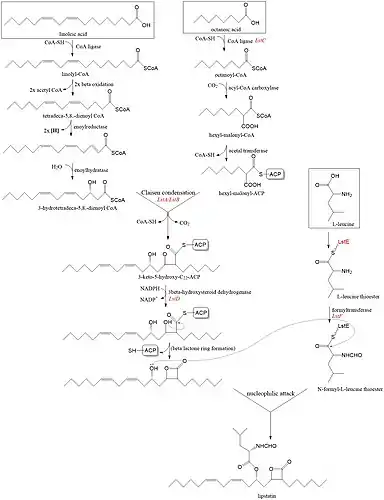 The N-formyl-L-leucine group is derived from L-leucine. L-leucine was activated by LstE forming thioester and its α-amine group is formylated by LstF. Finally, 5-hydroxyl of 22 carbon β-lactone backbone nucleophilic attacks on the acyl carbon of the formyl-leucine and forms the lipstatin.[2]