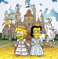 When Homer forces the kids to take classes at the recreation centre, Lisa takes part in a strict art class and meets a girl named Juliet Hobbes, who also likes Josh Groban. The two create a fantasy world that takes them away from reality.[1] They deem the land "Equalia" where they are the queens and everybody is equal. However, Lisa soon becomes distracted in school after becoming obsessed with the imaginary land. After meeting Juliet's family and seeing her disruptive behavior, Marge thinks Lisa's friend might be troubled, and after she becomes obsessed in their dreamworld, Marge attempts to stop her from seeing Juliet, much against Marge's original idea of trying to get Lisa a best friend.