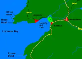 The Dealagh River and the Inagh River unite on the east side of the Lahinch Golf Club and enter Liscannor Bay together. The N67 and the R478 combine to outline the bay by road. The Cliffs of Moher begin at Hag's Head and run north along the coast.