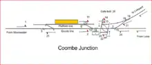 The subsequent Coombe Junction station was provided when the link line was opened on 15 May 1901, close to the site of the earlier stopping point. A loop line of 650 feet (200 m) was provided, and passenger services northward to Moorswater ceased. The platform was 90 feet (27 m) long, on a dead-end road with the running line to Moorswater alongside; there was a crossover at the north end and until 1938 there was a middle crossover.[7]