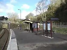 Looe passenger station (Cornish: Logh) was built in the area known as Shutta, some distance above Looe Bridge. It consisted originally of a single platform 75 feet (23 m) long, with basic facilities. The platform was extended to 200 feet (61 m) when the link at Liskeard was opened in 1901, and it was extended again by 96 feet (29 m) in 1928.[7] Arriving passenger trains moved to run-round facilities south of the station for the purpose, where there was also a carriage shed, and then re-entered the platform.