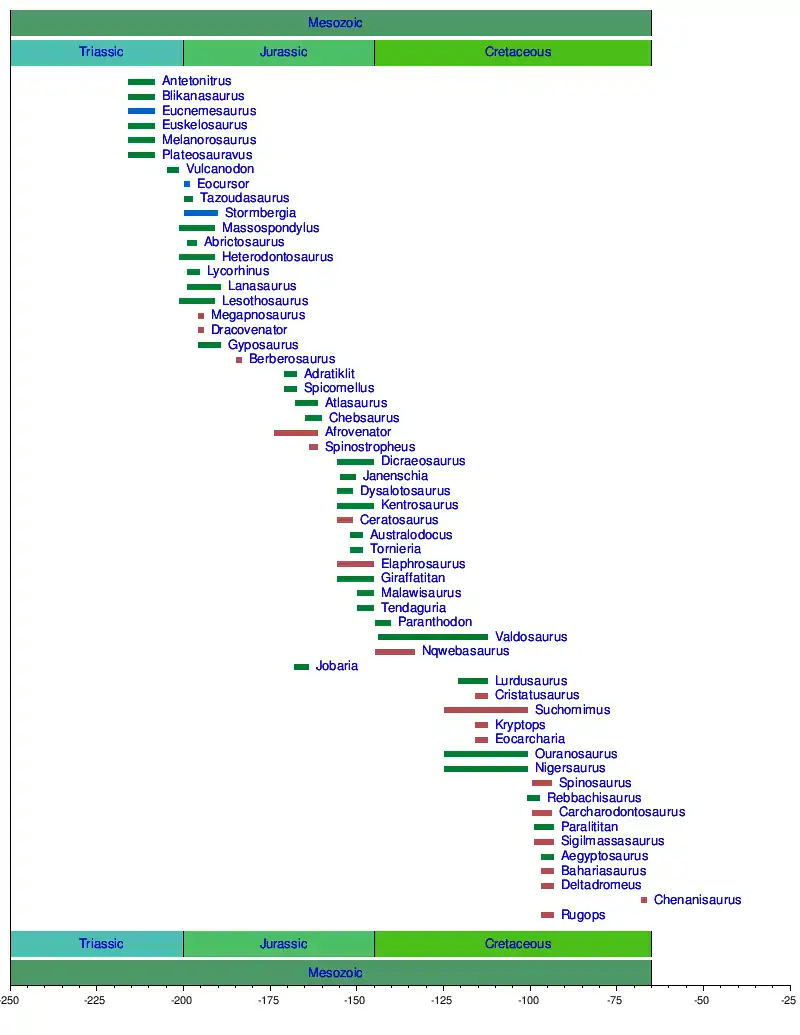 This is a list of dinosaurs whose remains have been recovered from Africa. Africa has a rich fossil record, but it is patchy and incomplete. It is rich in Triassic and Early Jurassic dinosaurs. African dinosaurs from these time periods include Coelophysis, Dracovenator, Melanorosaurus, Massospondylus, Euskelosaurus, Heterodontosaurus, Abrictosaurus, and Lesothosaurus. In the Middle Jurassic, the sauropods Atlasaurus, Chebsaurus, Jobaria, and Spinophorosaurus, flourished, as well as the theropod Afrovenator. The Late Jurassic is well represented in Africa, mainly thanks to the spectacular Tendaguru Formation in Lindi Region of Tanzania. Veterupristisaurus, Ostafrikasaurus, Elaphrosaurus, Giraffatitan, Dicraeosaurus, Janenschia, Tornieria, Tendaguria, Kentrosaurus, and Dysalotosaurus are among the dinosaurs whose remains have been recovered from Tendaguru. This fauna seems to show strong similarities to that of the Morrison Formation in the United States and the Lourinha Formation in Portugal. For example, similar theropods, ornithopods and sauropods have been found in both the Tendaguru and the Morrison. This has important biogeographical implications.