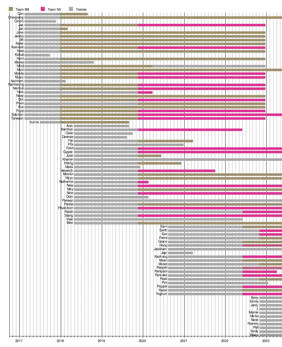 The original members of the group were recruited in mid-2016 and were announced in early 2017, comprising a total of 30 people. The second-generation 27 additional members were announced on 29 April 2018.[1] On 9 August 2020, 19 third-generation members were announced.[2] On 30 October 2022, 11 fourth-generation members were announced.[3] Some members have left the group in the process known as graduation. As of March 2023, the group consists of 43 members, of whom 14 constitute Team BIII, 15 constitute Team NV, and the rest is categorised as trainees.[4][5][6]