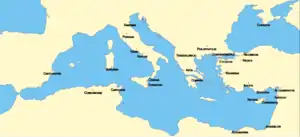 | Naples | After c. 661 to c. 830–840 | NE | Active from the reign of Constantine IV (r. 641–685– ), probably after c. 661/662 when it became the seat of a doux, to Theophilos (r. 829–842– ). Effectively outside imperial control as the doux became increasingly independent.[31] |