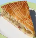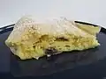 Cake | A cake consisting of three layers: The bottom one is either a yeast dough (Hefeteig) or one made with baking soda (Rührteig), the middle layer is a cream made of quark, vanilla and some butter, egg, sugar and milk, and the top layer is mainly made from eggs (Eier), which are beaten with butter, sugar and "Vanillepudding"-powder (starchy substance normally used to cook a dessert similar to semolina pudding). |