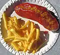 Berlin, Rhine-Ruhr | This large-format, fried or grilled wiener is cut into thick slices and seasoned with spicy ketchup and generous amounts of curry powder, usually served with french fries — a popular snack originating in early 1950s Berlin. Both Bockwurst-style (i.e. intended to be boiled) and Bratwurst-style (i.e. intended to be grilled or fried) sausages are used, depending on region, and the use of one or the other is a matter for much debate among Currywurst gourmets. Currywurst remains one of the most popular fast foods in Germany, especially in Berlin and the Rhine-Ruhr area, but the Döner kebab is gaining rapidly in popularity. |