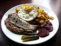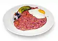 Main course or snack | A dish made from corned beef, herring, mashed potatoes, and beetroot, served with a fried egg and a pickled cucumber. |