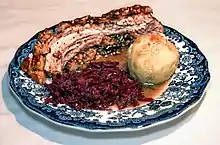 Main course | Roasted goose traditionally served with potatoes or Klöße with gravy and vegetables. |