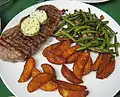 Main course | Roast beef served with various sides such as potato wedges and vegetables. |