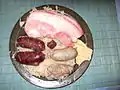 Snack | Barley groats cooked in sausage juices (Wurstbrühe), which are enriched with pieces of meat, offal, such as heart, kidney or liver and seasoned with spices and salt. The cooked ingredients are minced after the juices have been poured off and a crumbly cake is left which is held together with fat and which sets on cooling. |