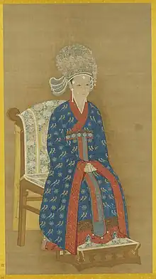 | Mianyi (面衣) or gaitou (蓋頭) | Veils or "facial clothes". | A purple gauze which hangs on a hat from the front to the back with 4 ribbons of different colours hanging down from on the shoulders. Originated from the Tang dynasty's weimao (帷帽).[38] | Adult | Song dynasty - Unknown | ![]() |