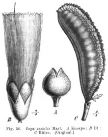 Inga sessilis. A. bud, B. single flower, C. pod