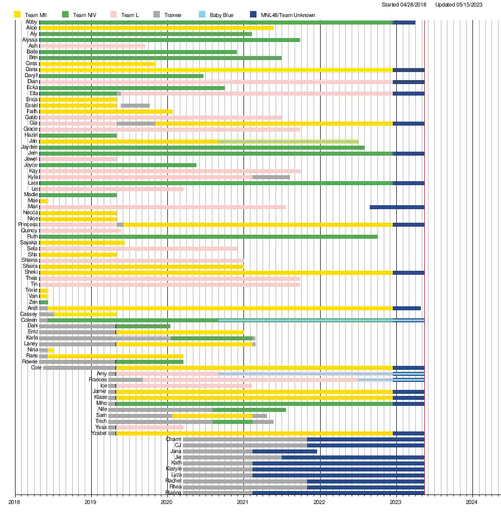 MNL48 consists of 26 official members. On December 15, 2022 at their MNL48 Christmas Concert, they announced of dissolution of teams, they separated by generations instead. In between, they were grouped into three teams. The teams were: