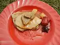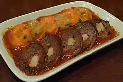 Meat dish | A beef roulade often prepared for special occasions it consists of thin sheets of cooked eggs and marinated beef layered one on top of the other, then wrapped and tied around carrots, celery, cheese, pork fat, and sausage. This is then cooked in seasoned tomato sauce. | |
