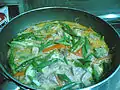 Generally means to cook and simmer in vinegar. Common dishes bearing the term, however, can vary substantially depending on what is being cooked. Paksiw na isda is fish poached in a vinegar broth usually seasoned with fish sauce and spiced with siling mahaba and possibly containing vegetables. Paksiw na baboy is pork, usually hock or shank, cooked in ingredients similar to those in adobo but with the addition of sugar and banana blossoms to make it sweeter and water to keep the meat moist and to yield a rich sauce. Paksiw na lechon is roasted pork lechon meat cooked in lechon sauce or its component ingredients of vinegar, garlic, onions, black pepper and ground liver or liver spread and some water. The cooking reduces the sauce so that by the end the meat is almost being fried. | ||
