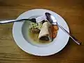 Meat/Vegetable dish | A variant of spring rolls, either deep or pan fried (prito), or fresh (sariwa). Popular versions include lumpiang shanghai, a fairly narrow fried roll usually with a meat filling, often accompanied by a sweet chili dipping sauce, and lumpiang ubod, a wider, fresh spring roll filled with raw vegetables local to the area. | |
