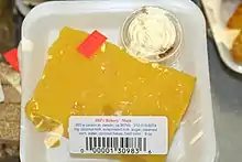 An edible thickening agent used to make jellies, flan, or desserts derived from dried seaweed. | ||
