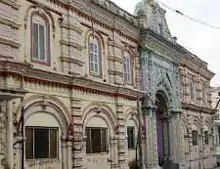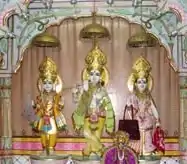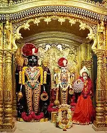 Swaminarayan temples, like other Hindu temples, have walkways around the central shrine to allow worshipers to circumambulate the shrine, which is often decorated with designs and inlaid marble. The main shrine area is divided by railings. One side of the railing is reserved for women, as Swaminarayan said that men and women should be separated in temples to allow full concentration on god. Men perform a specified number of prostrations. In front of the men's section, there is normally a small area reserved for ascetics and special guests. There is great variety in the form and nature of the central images, in front of which are gold- or silver-plated doors that open during darshan.[6] Swaminarayan ordered the construction of the following six mandirs and installed the images of various deities, such as Nara Narayana, Laxminarayan, Radha Krishna, Radha Ramana, Revti Baldevji, himself.[11]