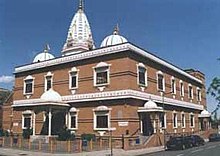 After the Second World War, members of the movement in East Africa began migrating to the United Kingdom; the number of migrants rose significantly in the 1960s and 1970s.[33] The first Swaminarayan temple in the UK was built in Bolton in 1973.[34] This was followed by a temple in the London suburb of Willesden, which was consecrated in 1975 and is the sect's biggest temple in the UK. Temples have been built in other parts of the UK, such as Cardiff, Oldham, Leicester and Brighton and several others in London. The temple in Leicester was opened in 1993 and was the first in Europe under the International Swaminarayan Satsang Organisation (ISSO) and was followed by one in Sweden.[35][36]