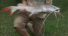| Pla sawai | ปลาสวาย | Iridescent shark | Traditionally boiled in tom yam or fermented with pineapple as khem mak nat. Now often cut in fillets, battered and deep-fried. | |
