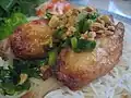 Huế | Noodle dish | Grilled pork (often shredded) and cold vermicelli noodles over a bed of greens (salad and sliced cucumber), herbs and bean sprouts. Also often includes a few chopped up egg rolls, spring onions, and shrimp. Served with roasted peanuts on top and a small bowl of nước chấm.[1][3][6] |