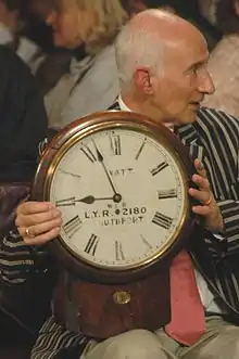 Paul Atterbury examines a clock on the Antiques Roadshow.