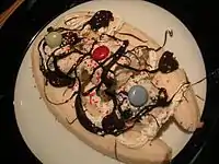 This is a list of banana dishes and foods in which banana or plantain is used as a primary ingredient. A banana is an edible fruit produced by several kinds of large herbaceous flowering plants in the genus Musa.[1] In some countries, bananas used for cooking may be called plantains. The fruit is variable in size, color and firmness, but is usually elongated and curved, with soft flesh rich in starch covered with a rind which may be green, yellow, red, purple, or brown when ripe. The fruits grow in clusters hanging from the top of the plant.