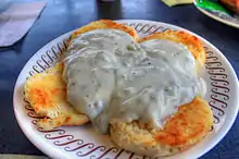 - Biscuits and gravy – Breakfast dish in the United States