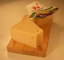 The Montafoner Sauerkäse (dialect: Sura Kees or in the Walgau and Rhine Valley Sura Käs) is a cheese made of soured-milk and has its origins in the Vorarlberger Montafon. Sour milk cheese is a lean cheese, so its fat content is very low. The protein content, however, does not suffer from fat loss due to the cream sabot. It is known in Vorarlberg since the 12th century and is similar to the Tyrolean grey cheese.[23] | |