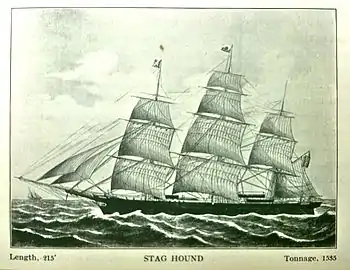 Burned in 1861 | 226 ft (69 m) | Stag Hound was designed by Donald McKay, and built in Boston in anticipation of the California Gold Rush. She was owned Sampson & Tappan (based in Boston), and when completed was the largest vessel in the American merchant marine. Stag Hound was a newer style of clipper which was designed for speed. Under Captain Josiah Richardson, she made a voyage from San Francisco to Canton, China in record time. Her around the world voyages paid for the ship and earned $80,000 for her owners. Her end came in 1861 when she caught fire off Pernambuco, Brazil. |