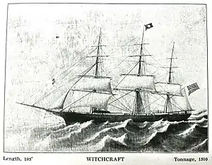 Wrecked in 1856 | 170.3 ft (51.9 m) | She was built by Smith & DiMonte of New York for owners Howland & Aspinwall. Her 140 ft mainmast carried 5 tiers of sails, as did the shorter fore and mizzen masts. In 1849, she made a record-setting run from Hong Kong to New York in 74 days under Captain Robert "Bully Bob" Waterman. The previous record had also been set by the same captain with the Sea Witch two years prior with a time of 77 days. |