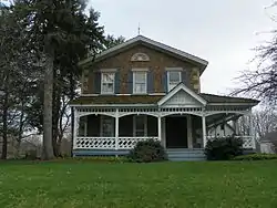 Aurora, Ohio | Two-story house with a steep gable, with eaves decorated by scroll-sawn vergeboard, topped by an octagonal pinnacle and pendant. Believed to be the only one of two cobblestone homes within the Western Reserve area.[8] |