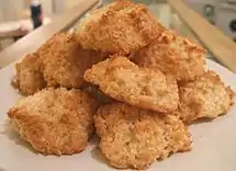 Europe | Cookies that consist of a paste of egg whites with coconut that is placed on a wafer and then baked. Its main ingredients are egg whites, sugar and shredded dried coconut. It is closer to a soft cookie than its meringue cousin, and is equally as sweet. |