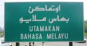 In Brunei, Standard Malay (Bahasa Melayu) is promoted as the national language and is the H variety, while Brunei Malay is used very widely throughout society and it constitutes the L variety.[18] One major difference between these dialects of Malay is that Brunei Malay tends to have the verb at the front, while Standard Malay generally places it after the subject.[19] It has been estimated that 84% of core vocabulary in Brunei Malay and Standard Malay is cognate,[20] though their pronunciation often differs very considerably. While Standard Malay has six vowels, Brunei Malay has only three: /a, i, u/.[21]