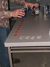 In liar's dice, five six-sided dice are used per player, with dice cups used for concealment.