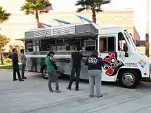 A food truck, mobile kitchen, mobile canteen, roach coach, gut truck, catering truck, or (in Austin, Texas) food trailer, is a mobile venue that transports and sells food. Some, including ice cream trucks, sell frozen or prepackaged food; others resemble restaurants on wheels. Some may cater to specific meals, such as the breakfast truck, lunch truck or lunch wagon, snack truck, kebab trailer (UK), break truck, or taco truck. This list includes notable food trucks companies, and is not a comprehensive list of all food trucks companies.