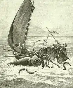 Tales of giant squid have been common among mariners since ancient times, but the animals were long considered mythical and often associated with the kraken of Nordic legend.[4] The giant squid did not gain widespread scientific acceptance until specimens became available to zoologists in the second half of the 19th century, beginning with the formal naming of Architeuthis dux by Japetus Steenstrup in 1857, from fragmentary Bahamian material collected two years earlier (#14 on this list).[5][nb 2] In the same work, Steenstrup also named a second species, Architeuthis monachus, based on a preserved beak, the only part saved from a carcass that washed ashore in Denmark in 1853 (#13).[19] The giant squid came to public prominence in 1861 when the French corvette Alecton encountered a live animal (#18) at the surface while navigating near Tenerife. A report of the incident filed by the ship's captain[20] was almost certainly seen by Jules Verne and adapted by him for the description of the monstrous squid in Twenty Thousand Leagues Under the Sea.[3]