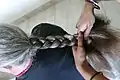 A braid, also known as a plait, is a type of hairstyle usually worn by women with long hair in which all or part of one's hair is separated into strands, normally three, and then plaited or braided together, typically forming one braid hanging down at the back of the head or two braids hanging down on either side of the head. Braids can also be strengthened or lengthened with the addition of weaving hair. Braids may also serve as the base for sewing on additional weave hair on top of the braid for additional hair styling options. See also cornrows, queue, crown braid (below), Dutch braid and pigtail. |