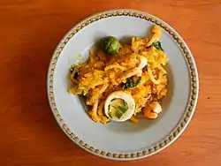 - Singapore-style noodles – stir-fried cooked rice vermicelli, curry powder, vegetables, scrambled eggs and meat, most commonly chicken, beef, char siu pork, or prawns, yellow in colour