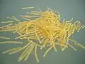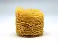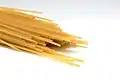 Spaghetti A long, thin, cylindrical pasta of Italian origin, made of semolina or flour and water.[38] Spaghettini and spaghettoni are slightly thinner or thicker, respectively.[39] "Little strings".[4] Spaghetti is the plural form of the Italian word spaghetto, which is a diminutive of spago, meaning "thin string" or "twine".[38] Fide/fidi, fidelini, ristoranti, vermicelloni, filatelli, vermicelloni giganti[9][39] Sicily