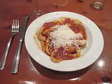 There are many different varieties of pasta.[1] They are usually sorted by size, being long (pasta lunga), short (pasta corta), stuffed (ripiena), cooked in broth (pastina), stretched (strascinati) or in dumpling-like form (gnocchi/gnocchetti). Yet, due to the variety of shapes and regional variants, "one man's gnocchetto can be another's strascinato".[2]