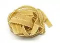 Pappardelle Thick flat ribbons[28] of egg-based dough From Tuscan papparsi, "to pig out".[31] Papparelle,[9] paparele (Veneto); paspardelle (Marche)[31] Tuscany and northern Italy[31]
