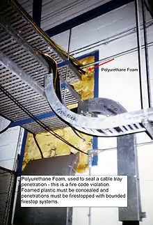 Approved polyurethane sealants (which is different from foam) are available in one, two and three part systems, and in cartridges, buckets or drums. Polyurethane sealants (such as EZ-Poly) are used to fill gaps thereby preventing air and water leakage. They are also used in conjunction with inorganic insulation, such as rockwool or ceramic fibres, for firestopping. Firestops can thwart smoke and hose-stream passage. The Browns Ferry Nuclear Power Plant used flammable polyurethane foam as a firestop, which was accidentally ignited and caused a major fire.