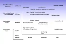 Polyurethane formulations cover an extremely wide range of stiffness, hardness, and densities.[1] These materials include: