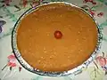 Most often refers to a dessert, but can also be a savory dish. Depending on its ingredients such a pudding may be served as a part of the main course or as a dessert. | |