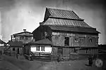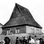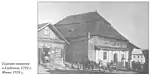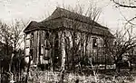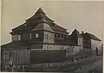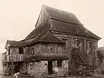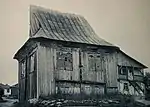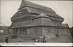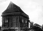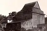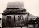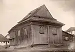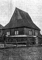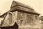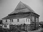 1750 - 1941 | The synagogue building was a wooden structure built on a stone foundation. The walls of were cut from edged logs into a clean corner. The central log house was dominant in height, to which side log houses were adjoined as covered galleries. A pentagonal structure was added to the main facade, which covered the main entrance. The building was covered with a high gable roof, with a complex plan and numerous outbuildings. In the end of 19th - beginning of 20th century the roof was covered with tin.[36]