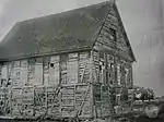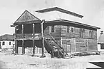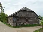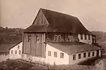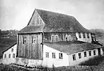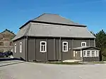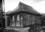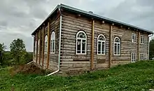 The synagogue is a wooden log structure of rectangular plan, built on a rough-stone concrete foundation and divided into two floors in the west. The structure is spanned with a hipped rafter roof covered with tin. On the exterior, the building is protected with horizontal weather-boarding above the windowsills of the prayer hall, and a vertical one below them.[3] A prayer hall of almost square plan is situated on the eastern side. On the western side, the building includes a vestibule and a small room with a stove, which also heated the prayer hall. A staircase in the southwestern corner leads to a women's section on the first floor, which opens to the prayer hall with two long rectangular windows. The main entrance to the building is in the western wall and the women's entrance is on the southern wall. Ten round-headed windows opened from the prayer hall: three windows on the southern and northern walls and two pairs of windows on the eastern wall. The windows of the vestibule and the women's section are rectangular. The ceilings are joisted flat constructions; that of the prayer hall is supported by two large beams, resting on the western wall of the women's section and the eastern wall of the prayer hall.[4] | ![]() |